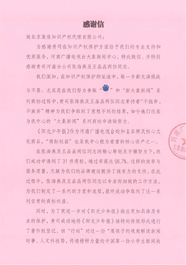 感謝信中提到,集佳工作人員在為客戶(hù)爭(zhēng)取“陽(yáng)光少年報(bào)”系列商標(biāo)過(guò)程中精心籌劃、不懈努力,取得了意想不到的成果,成功申請(qǐng)到31件商標(biāo),通過(guò)率高達(dá)96.7%。同時(shí),《陽(yáng)光少年報(bào)》作為河南廣播電視臺(tái)的知名品牌及核心文化商品,為了更進(jìn)一步對(duì)其開(kāi)展具體及專(zhuān)業(yè)的保護(hù),集佳成功將《陽(yáng)光少年報(bào)》獨(dú)特的排版形式進(jìn)行了著作權(quán)登記,對(duì)這份“用孩子的視角解讀新聞時(shí)事、人文科技等,傳遞榜樣力量的中國(guó)第一份小學(xué)生新聞故事報(bào)”從多角度進(jìn)行了有效的法律保護(hù),進(jìn)一步鞏固了該份報(bào)紙的市場(chǎng)地位。這些努力在一定程度上為未來(lái)“大象新聞”品牌的發(fā)展奠定了更加堅(jiān)實(shí)的基礎(chǔ),也為客戶(hù)未來(lái)的商標(biāo)戰(zhàn)略鋪平道路。對(duì)此,客戶(hù)對(duì)集佳表達(dá)誠(chéng)摯感謝與加深合作的美好期望!