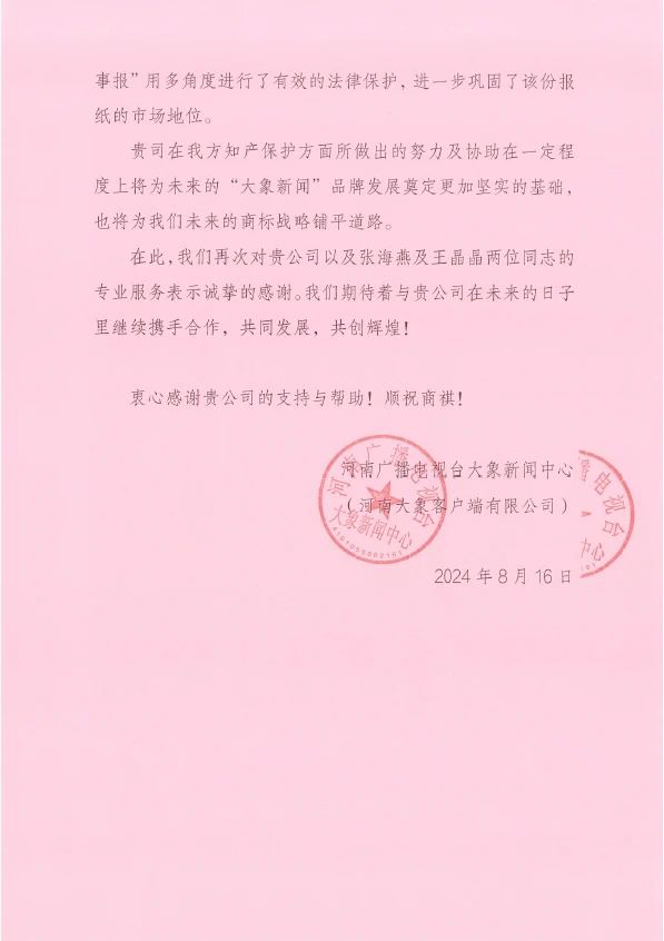 近日,我們收到河南廣播電視臺(tái)大象新聞中心(河南大象客戶(hù)端有限公司)的感謝信,對(duì)集佳在知識(shí)產(chǎn)權(quán)方面給予的專(zhuān)業(yè)支持與優(yōu)質(zhì)服務(wù)表示衷心感謝,并熱情稱(chēng)贊集佳河南分公司張海燕與王晶晶在服務(wù)中展現(xiàn)出的“不拋棄、不放棄”的鉆研精神與專(zhuān)業(yè)細(xì)致的工作態(tài)度!