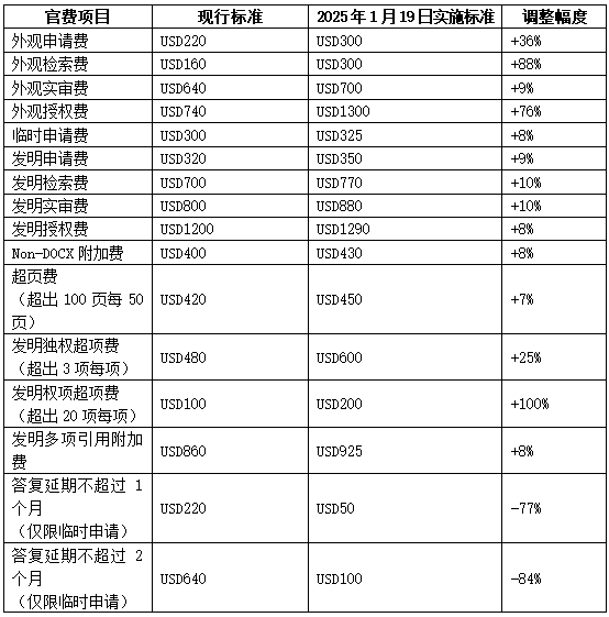 根據(jù)2024年11月20日公布的聯(lián)邦公報(bào),美國專利商標(biāo)局(簡稱USPTO)發(fā)布最終的官費(fèi)調(diào)整規(guī)則的決定,新官費(fèi)標(biāo)準(zhǔn)將于2025年1月19日生效實(shí)施。