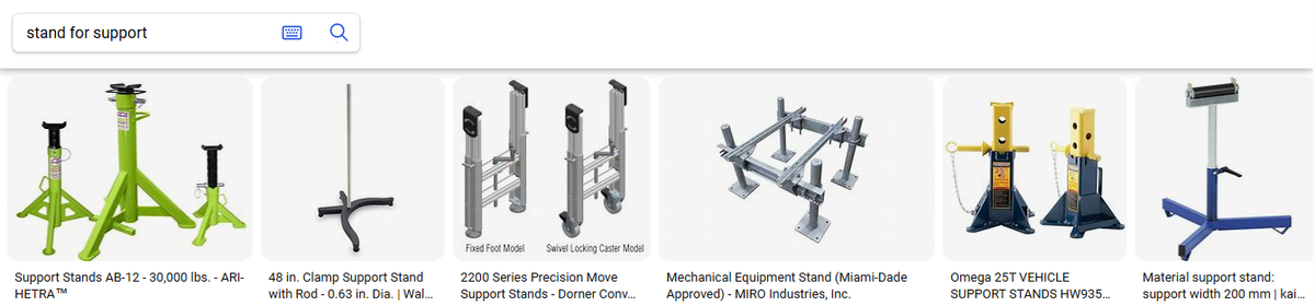 使用圖片搜索以模擬閱讀者對術(shù)語的理解,十分適用于機(jī)械領(lǐng)域的術(shù)語辨析,尤其是針對家電等生活化的領(lǐng)域。比如,“bracket”和“stand”是“支架”的兩種翻譯,通過圖片搜索,可以清晰看到其差別,即“bracket”多指安裝在墻上的支架,而“stand”多指立式支架,如圖2所示。