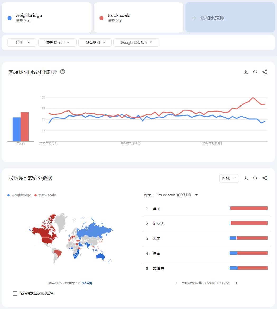 谷歌趨勢呈現(xiàn)了詞語被全球用戶搜索的頻率。通過谷歌趨勢,我們可以對比一個術(shù)語的多種翻譯的常見程度,以及在不同國家的偏好。尤其是對于名詞短語,通過比較不同搭配的常見程度,可以確定它們的自然程度。如圖3所示,對于“地磅”這個術(shù)語,北美和歐陸地區(qū)傾向于使用“truck scale”,而英國、印度、澳大利亞等傾向于使用“weighbridge”,兩者總體的使用頻率卻差別不大,因此可以根據(jù)申請進(jìn)入的國家選擇最合適的譯文,有利于為客戶提供更精細(xì)化的服務(wù)。在另一些應(yīng)用中,使用頻率偏小的譯法可能意味著不夠地道,因此為術(shù)語翻譯提供了參考。