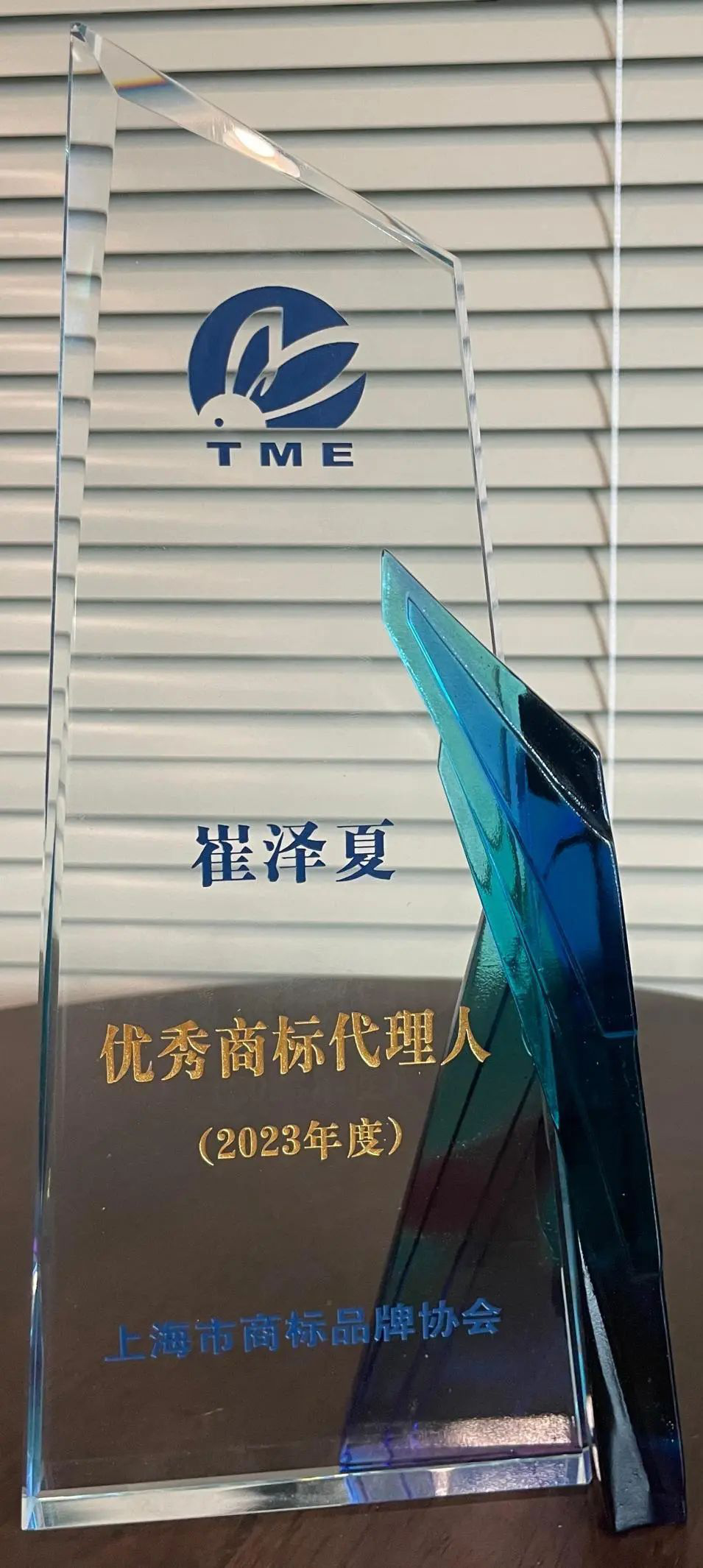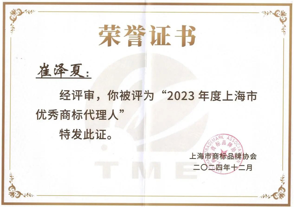 集佳上海分所崔澤夏律師被評(píng)為2023年度“上海市優(yōu)秀商標(biāo)代理人”。