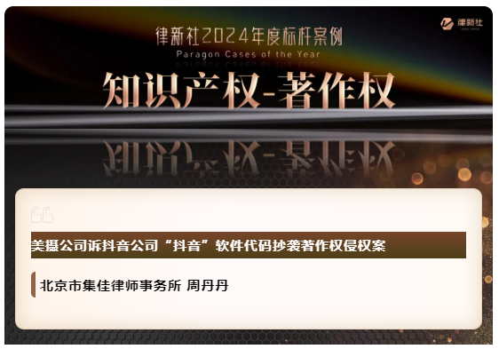 北京市集佳律師事務(wù)所憑借在知識產(chǎn)權(quán)保護(hù)領(lǐng)域卓越的專業(yè)實力與良好的行業(yè)口碑,入選《律所卓越品牌影響力指南(2024)》,榮獲“律新社2024年度精品品牌律所30佳”獎項;同時,集佳周丹丹律師代理的“美攝公司訴抖音公司'抖音'軟件代碼抄襲著作權(quán)侵權(quán)案”獲評“律新社2024年度標(biāo)桿案例:知識產(chǎn)權(quán)-著作權(quán)領(lǐng)域”。