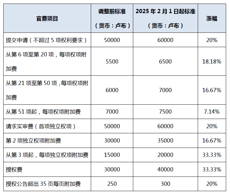 歐亞專利局于2025年1月14日公布通知,稱由于通貨膨脹與匯率波動(dòng),歐亞專利申請的部分費(fèi)用將需要調(diào)整。目前調(diào)整后的費(fèi)用已于2025年2月1日生效。